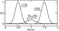 Отсюда следует, что для ВКФ не выполняется условие четности, а значения ВКФ не обязаны иметь максимум при t = 0. Это можно наглядно видеть на рис. 2.4.1, где заданы два одинаковых сигнала с центрами на точках 0.5 и 1.5. Вычисление по формуле (2.4.3) с постепенным увеличением значений t означает последовательные сдвиги сигнала s2(t) влево по оси времени (для каждого значения s1(t) для подынтегрального умножения берутся значения s2(t+t)).