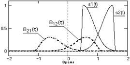 При t=0 сигналы ортогональны и значение B12(t)=0. Максимум В12(t) будет наблюдаться при сдвиге сигнала s2(t) влево на значение t=1, при котором происходит полное совмещение сигналов s1(t) и s2(t+t). При вычислении значений B21(-t) аналогичный процесс выполняется последовательным сдвигом сигнала s1(t) вправо по временной оси с постепенным увеличением отрицательных значений t, а соответственно значения B21(-t) являются зеркальным (относительно оси t=0) отображением значений B12(t), и наоборот. На рис. 2.4.2 это можно видеть наглядно.