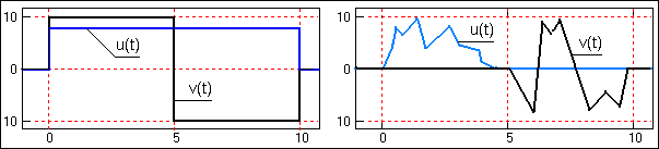 На рисунке 2.3.1 приведены примеры взаимно ортогональных сигналов. Нулевое скалярное произведение двух левых сигналов обеспечивается их формой (равна нулю сумма положительных и отрицательных значений произведения сигналов), а двух правых - взаимным расположением (ненулевые значения сигналов не имеют общих координат).