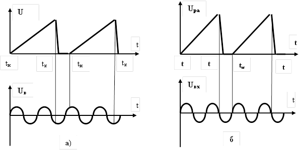 Рис.4.Временные диаграммы работы блока синхронизации (а – сигнал развертки и исследуемый сигнал не синхронизированы, б – сигналы синхронны).