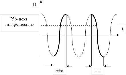На Рис.5. жирной линией выделены: - «+» - зона нарастания исследуемого сигнала на которой выбирается уровень синхронизации, определяющий момент запуска генератора линейно нарастающего напряжения А, в случае если исследуемый сигнал совпадает по уровню с заданным напряжением (уровнем синхронизации).