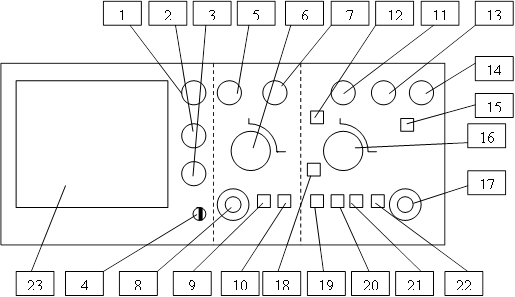 Расположение органов управления осциллографом приведено на Рис.6 (для примера взят эскиз передней панели осциллографа ОСУ -10А)