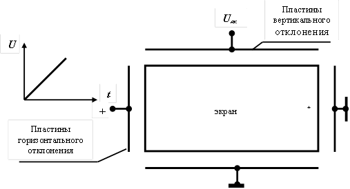 В основе осциллографа лежит электронно-лучевая трубка – прибор, обеспечивающий формирование движения электронного луча по люминесцирующему экрану, на котором траектория движения рисуется в виде светящейся кривой. Для получения изображения на экране необходимо перемещать луч в двух взаимно перпендикулярных направлениях. В одном направлении скорость перемещения луча должна быть постоянной, назовем это направление горизонтальным Рис.1. Для этого, путь, пройденный лучом по экрану должен подчиняться закону - X=Vt, а напряжение, формирующее скорость перемещения луча по горизонтали подчиняться закону - U=U0t.