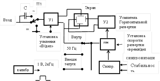 Исследуемое напряжение поступает на вход усилителя вертикального отклонения. Входной разъем подключается ко входу усилителя вертикально развертки – У1 переключателем – П1. Положение переключателя ~ позволяет не пропустить на вход усилителя У1 постоянную составляющую входного сигнала, если она в нем имеется. В положении переключателя – П1 – обозначенном знаком