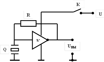Принцип работы генератора с кварцевой стабилизацией не отличается от принципа работы генератора с резонансным контуром. При включении напряжения питания на кварцевый кристалл подается перепад напряжения, который возбуждает механические колебания кварцевой пластины. Механические колебания кварцевого кристалла генерируют электрические колебания, которые подаются на вход усилителя –К. Резистор R – обеспечивает соблюдение амплитудного условия возбуждения незатухающих колебаний. Выбор частоты в данном случае определяется параметрами использованного кварцевого резонатора. Для подавления колебаний на более высоких частотах кристалл кварца шунтируется емкостью. Так как кварцевый резонатор имеет строго фиксированный набор гармонических колебаний кристаллической решетки, то плавная перестройка диапазона генерируемых частот гармонических сигналов в широком диапазоне невозможна, поэтому широкодиапазонные генераторы, стабилизированные кварцем, состоят из обычного LC –генератора, синхронизированного кварцем.