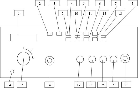 предварительного усилителя, имеющего регулировку коэффициента усиления (потенциометр 20), для получения на выходе генератора необходимого уровня выходного напряжения. Усилитель мощности УМ обеспечивает необходимую мощность выходного сигнала. Выходное сопротивление УМ равно 50 Ом на выходе (21) - “Output 50 Om”. Выходной сигнал на этом выходе может быть симметричным относительно общей шины или иметь смещение, регулируемое потенциометром (19) – смещение (offset). В структуру генератора включен частотомер, позволяющий контролировать частоту генерируемых сигналов. Встроенный частотомер можно использовать для измерения частоты сигнала, подаваемого на вход частотомера от внешнего источника сигналов. Входной разъем частотомера расположен на задней стенке прибора.
