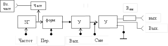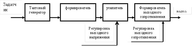 На приведенной схеме тактовый генератор формирует последовательность периодического сигнала с частотой, устанавливаемой органом управления - «Задатчик частоты». Формирователь преобразует тактовые сигналы в сигнал требуемой формы. Усилитель обеспечивает необходимую амплитуду и мощность выходного сигнала. Значение требуемой амплитуды регулируется органом управления – «регулировка выходного напряжения. К выходу усилителя подключен формирователь выходного сопротивления генератора. Значение выходного сопротивления задается органом управления – «регулировка выходного сопротивления. Сигнал с генератора подключается к нагрузке с помощью выходного соединителя.