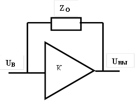 На вход усилителя, имеющего коэффициент усиления k, поступает напряжение входного сигнала UВХ, усиливается им до напряжения UВЫХ = kUВх, и через сопротивление обратной связи ZОС вновь подается на вход усилителя. Сопротивление обратной связи ослабляет выходной