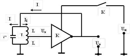 Генератор работает следующим образом. При включении питания ключом Кл, по цепям генератора потекут токи, и на выходе усилителя К появится напряжение. По цепи обратной связи потечет ток Iз. Токи в параллельных ветвях контура Ic, IL сдвинуты по фазе друг относительно друга, что приводит к возникновению колебаний на собственной резонансной