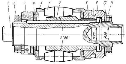 На рис. 6.29 представлена роликовая раскатка, используемая для чистовой обработки внутренних цилиндрических поверхностей(гильз, цилиндров, головок шатунов). Приспособление для раскатки состоит из шпинделя /, имеющего посадочное отверстие для закрепления в шпинделе станка. На наружной поверхности шпинделя в сепараторе 5 размещены деформирующие ролики 6, которые опираются на коническую поверхность подвижной в осевом направлении втулки 8, соединенной со шпинделем 1 шпонкой 7. Для ограничения перемещения сепаратора в осевом на правлении служат с одной стороны упорное кольцо 4, закрепленное через стопорное кольцо 3 гайками 2, а с другой стороны — регулировочная гайка 9, служащая для настройки раскатки на требуемый рабочий размер. Регулировка размера осуществляется вращением гайки 9, что приводит к перемещению сепаратора 5с роликами 6 вдоль конической поверхности втулки 8. После установки требуемого размера регулировочная гайка фиксируется при помощи стопорного кольца 10 и гайками 11.