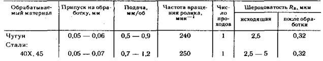 Деформирующие ролики изготавливают из шарикоподшипниковой стали ШХ 15 и термически обрабатывают до твердости НКС 62 — 64. Ролики имеют заборную и калибрующую часть с углом конца 1°26'. Для уменьшения действующей силы, ролики располагают под углом к оси обрабатываемого отверстия, что приводит к получению своеобразного каплевидиого отпечатка ролика. Это создает более благоприятные условия для пластического деформирования поверхностных слоев металла. Режимы раскатки цилиндрических отверстий приведены в табл. 6.7. При использовании для обработки отверстий описанной роликовой раскатки и рекомендуемых режимов раскатки достигается требуемая точность размеров деталей и повышается на 20—30 % усталостная прочность деталей. Для обкатывания наружных цилиндрических поверхностей наиболее широко используются шариковые накатники (рис. 6.30) жесткого действия. Накатывание выполняют на токарных станках, накатник устанавливается в суппорте вместо резца.