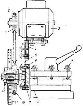 На заднем конце вала шпинделя головки установлен подшипниковый корпус 1 с вилкой 13. Фланец 4-связан подвижно с корпусом 1 направляющими стержнями 6 и пружинами 2. На внутренней стороне фланца 4 имеется упор 3, который при сжатии пружин замыкает вилку 13. На жестко закрепленной цилиндрической горизонтальной направляющей 8 установлен подвижной ползун 9, который фиксируется в крайнем правом положении пружиной сжатия П. Ползун 9 шарнирно связан с вилкой 13 рычагами 12 и 7, На траектории движения ползуна 9 установлен концевой выключатель 10, который имеет возможность перемещаться параллельно направляющей 8 в пределах расстояния 1. Концевой выключатель 10 запитан в общую цепь управления работой установки.