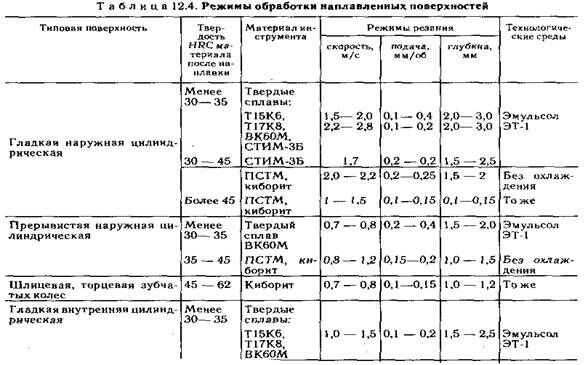 В табл. 12.4 приведены режимы обработки и материалы инструмента для обработки наплавленных поверхностей различной твердости.