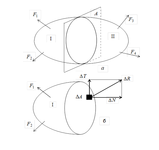 Внутренние силы. Метод сечений. Внутри любого материала имеются внутренние межатомные силы. Если к твердому телу (рис. 1,а) приложить внешние силы, то оно будет деформироваться. При этом изменяются расстояния между частицами тела, что в свою очередь приводит к изменению сил взаимного притяжения между ними. Отсюда, как следствие, возникают внутренние усилия. Для определения внутренних усилий используют метод сечения. Для этого тело мысленно рассекают плоскостью и рассматривают равновесие одной из его частей (рис. 1,б). Метод сечений позволяет выявить внутренние силовые факторы, но для оценки прочности необходимо знать внутренние силы в любой точке сечения. С этой целью введем числовую меру интенсивности внутренних сил – напряжение.