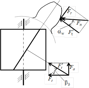 Силы, действующие в косозубой цилиндрической передаче. В косозубой зубчатой передаче нормальную силу раскладывают на три составляющие (рис. 56): окружную силу