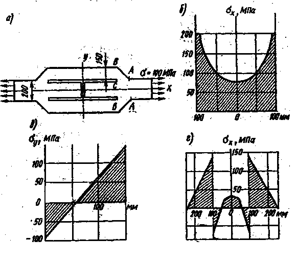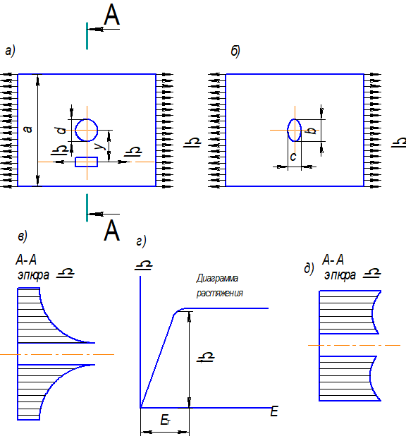 Рис. 5.1 Концентрация напряжений: а — в полосе е круглым отверстием; б — в полосе с эллиптическим отверстием; в — распределение σ в упругой стадии, г — распределение σ в пластической стадии нагружения.