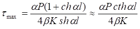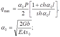 В паяных соединениях нахлесточного типа распределение касательных напряжений т по длине нахлестки в направлении действия сил происходит неравномерно и в значительной степени аналогично условиям работы сварных фланговых швов. Для соединения двух деталей с равными площадями поперечных сечений A=sb (рис. 4.13) наибольшее значение усилия qmax на единицу длины паяного шва в концевых точках определяется уравнением