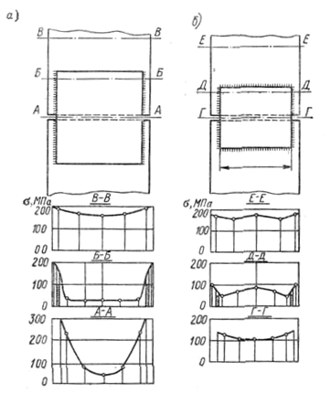 Распределения напряжений в накладках с лобовыми швами показаны на Рис. 5.5. Наибольший коэффициент концентрации равный двум имеет место в сечении А—А (Рис. 5.5, б). В нахлесточных соединениях с двумя лобовыми швами усилия между ними распределяются равномерно, в случае если элементы имеют равные толщины.