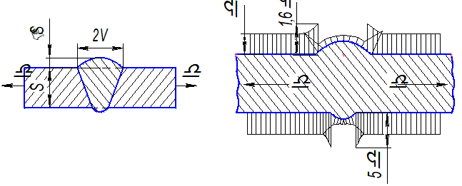 Когда поверхность имеет форму, показанную на (Рис. 5.3,а), распределение напряжений по сечению становится неравномерным. На (Рис. 5.3,б) показано распределение напряжений в стыковом соединении. Зоны шва, сопрягаемые с основным металлом, испытывают концентрацию напряжений. Средние напряжения на оси шва несколько меньше напряжений в основном металле вне соединения.