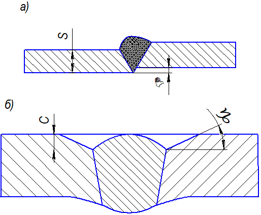 Вторым источником концентрации может служить смещение одного элемента относительно другого (Ошибка! Источник ссылки не найден. а, б), а также в результате местных деформаций, вызванных неравномерным сокращением шва.
