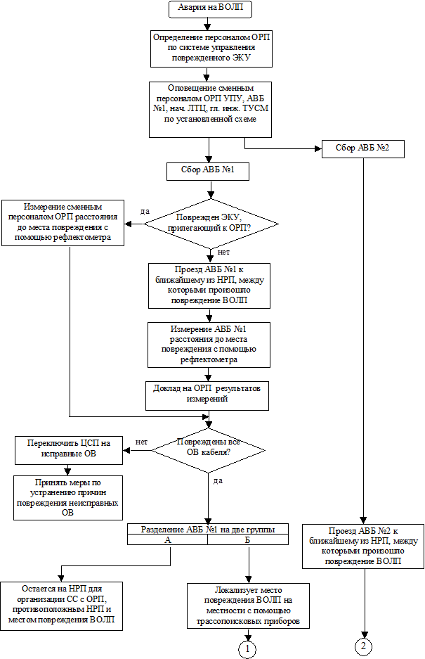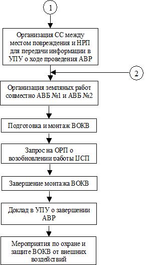 АВР являются составной частью технического обслуживания ЛКС ВОЛП, проводимого на ЭКУ в соответствии с положениями [92]. Это особый вид ремонтных работ на линиях передачи, основным требованием к которым является их немедленная организация в объемах, обеспечивающих восстановление передачи информации в кратчайшие сроки и их проведение вплоть до установления постоянного или временного варианта восстановления даже при неблагоприятных внешних условиях. В процессе АВР выполняется широкий спектр работ - измерительные, монтажно-кабельные, земляные, охранные (надзор) и т.п.
