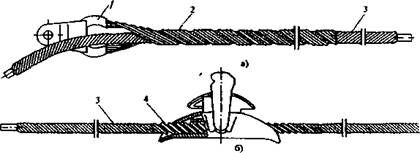 На опорах ВЛ обводные петли кабеля ОКНН крепятся к грозотросу и металлоконструкциям с помощью специальных зажимов, один из которых навешивается на грозотрос со стороны подхода навивочной машины, а другой - с противоположной стороны в следующем пролете.