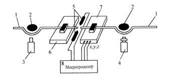 Рис. 10.7. Схема контроля качества юстировки по результатам измерения мощности оптического сигнала: 1 - концы свариваемых ОВ; 2 - устройство ввода (вывода) излучения в ОВ на изогнутом участке; 3 - источник оптического излучения; 4 - приемник оптического излучения; 5 - электроды сварочные; 6 - неподвижное устройство фиксации ОВ; 7 - подвижное устройство фиксации ОВ, перемещающееся в плоскостях x, y, z; 8 - блок управления с устройством вывода информации.