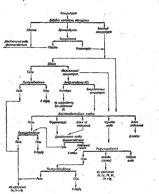 При переработке сложных руд на первичных обогатительных фабриках обычно получают бедные концентраты, содержащие 10—30% Sn, направляемые на центральную доводочную фабрику, схема обогащения которой позволяет селективно разделять комплексные концентраты различными методами (флотогравитация, магнитная и электрическая сепарация, гравитация, флотация и др.) и гидрометаллургии. При переработке бедных концентратов, содержащих 5—15% Sn, возможно применение других химико-металлургических процессов.