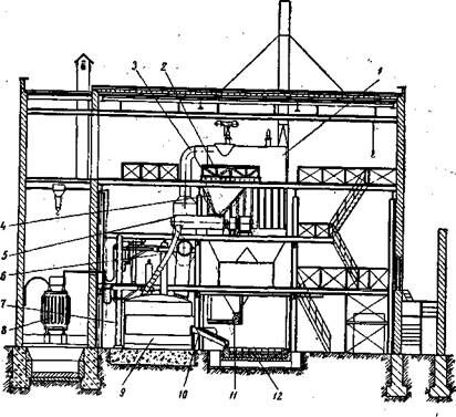 1- электрофильтр; 2- шихтовая площадка; 3 — газоход; 4 - загрузочный бункер; 5-скруббер; 6-загрузочный рукав; 7 - электрододержатели; 8 - трансформатор, 9 - электропечь; 10 - летка; 11 - шнек для разгрузки пыли; 12 -отстойник