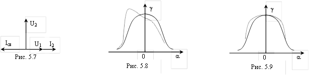 Как видно из рис. 5.5, с изменением частоты проводимость gвхос меняет знак. Если gвхос положительна, то усилитель отбирает энер­гию от источника сигнала, т. е. внутренняя ОС отрицательная. Если же gвхос отрицательна, то это означает, что во входную цепь вносит­ся энергия, следовательно, ОС положительная. Таким образом, в резонансных усилителях характер ОС с частотой меняется, посколь­ку с изменением частоты относительно резонансной меняется знак напряжения U2 на контуре. Пояснить возникновение отрицательной входной проводимости за счёт действия обратной связи можно следующим образом. На частотах ниже резонансной выходной контур имеет индуктивное сопротивление. Поэтому напряжение U2опережает ток I2 на угол, близкий к 900(рис. 5.7). Из-за этого напряжения возникает ток Ioc через Ск, опережающий напряжение ещё на 900. Так как ток I 2 синфазен с входным напряжением U1, сдвиг фаз между U1 и Ioc равен 1800, что эквивалентно отрицательной входной проводимости.
