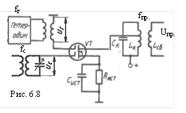 Схема ПрЧ с совмещенным гетеродином представлена на рис. 6.9. Коллекторный ток транзистора содержит помимо составляющих с частотами