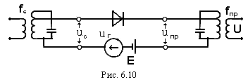 В большинстве приёмников СВЧ диапазона в качестве ПЭ используются кристаллические диоды, обладающие малой инерционностью и сравнительно малыми шумами. Недостатком их является отсутствие усилительных свойств. Такие ПрЧ применяются и профессиональных РПрУ декаметрового диапазона. Вариант схемы диодного ПрЧ показан на рис. 6.10. В СВЧ приёмниках входной контур выполняют в виде отрезков полосковых или коаксиальных линий или в виде объёмных резонаторов.