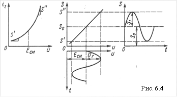 ПЭ может представлять собой как активный так и пассивный элемент (транзистор, диод и т.п.) с нелинейной ВАХ, крутизна которой в разных точках различна и меняется при изменении режима работы (рис. 6.4). Назначение гетеродина – периодически с частотой fг изменять параметры ПЭ для напряжения сигнала (прежде всего крутизну) за счёт изменения режима работы. Линейность по сигналу достигается малым уровнем входного сигнала, при котором любой участок нелинейной ВАХ для сигнала можно считать линейным (с разным значением крутизны). На рис. 6.4 приведён пример квадратичной ВАХ ПЭ. На входе ПЭ действует сумма сигнала и гетеродина, причём Uc<<Uг, а также некоторое начальное смещение Есм. можно считать, что для сигнала под действием напряжения гетеродина периодически с частотой fг меняется режим работы, определяемый точкой покоя на ВАХ с соответствующим значением крутизны. Например, на рис. 6.4 крутизна меняется в пределах от S' до S". На том же рисунке показаны зависимости крутизны S(Uвх) для приведенной квадратичной ВАХ (т.к.