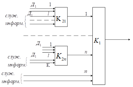 . Входы с (n+1) до m используются для передачи служебной информации и осуществления синхронизации, аналоговые входы с (l+1) до К коммутаторов