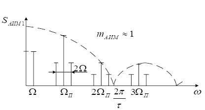 Особенностью спектра АИМ1 является то, что амплитуда составляющей на частоте модуляции не зависит от частоты, а амплитуды боковых составляющих при гармониках