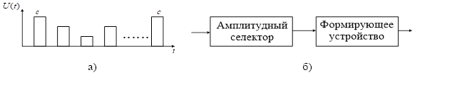 Маркерная синхронизация осуществляется путем передачи в начале кадра синхроимпульса (маркера), отличающегося от информационных и других служебных сигналов. В приемной станции осуществляется обнаружение и выделение маркерного сигнала, из которого формируется кадровый сигнал. Структура селектора маркерного сигнала зависит от его формы. Если маркерный сигнал отличается по амплитуде от информационных импульсов, то схема селектора имеет вид (рисунок 9.31).