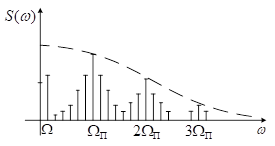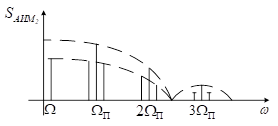 Спектр АИМ1 содержит: постоянную составляющую, составляющую на частоте модуляции, бесконечную сумму гармоник, составляющую на частотах