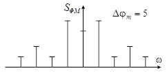Спектр ФМ колебания содержит бесконечное число дискретных составляющих даже при модуляции одним гармоническим колебанием. На уровне 0,01 от амплитуды немодулированной несущей ширина спектра ФМ колебания равна