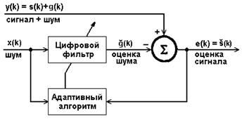 Фильтр состоит из блока цифрового фильтра с регулируемыми коэффициентами и адаптивного алгоритма для настройки и изменения коэффициентов фильтра. На фильтр одновременно подаются входные сигналы y(k) и x(k). Сигнал y(k) содержит полезный сигнал s(k) и некоррелированный с ним загрязняющий сигнал g(k). Сигнал x(k) какого-либо источника шума коррелирован с g(k) и используется для формирования оценки сигнала ğ(k). Полезный сигнал оценивается по разности: