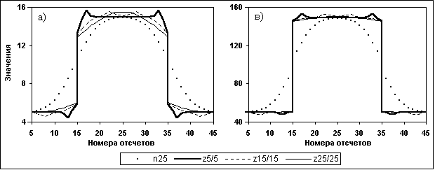 Результаты моделирования подтверждают преимущество СРД перед простыми методами сглаживания. В числовой форме это наглядно проявляется в снижении дисперсии отсчетов выходного массива Z при практическом сохранении средних значений массива N и для фоновых отсчетов, и для амплитудных значений сигнала. При простом сглаживании "развал" фронтов сигнала (подавление высокочастотных составляющих спектра сигнала), как и должно быть при использовании низкочастотных фильтров, вызывает снижение по отношению к исходному массиву средних значений в максимумах и повышение фоновых значений сигнала, которое тем больше, чем больше окно весовой функции. Этот эффект особенно отчетливо проявляется в интервале окна фильтра по обе стороны от резких изменений сигнала.