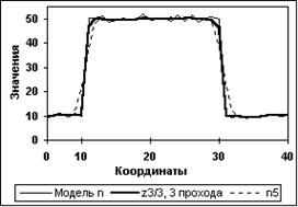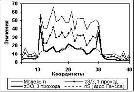 На рисунках 11.3.8 и 11.3.9 приведены результаты статистической обработки 3-х проходной СРД для 25 циклов моделирования в сравнении с 1-м проходом и с 5-ти точечным фильтром Лапласа-Гаусса (кривая n5).
