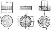 | Рис.3.1. Макроструктура зубчатых колес, изготовленных: а - из проката; б - штамповкой из полосы; в - осадкой из прутка |