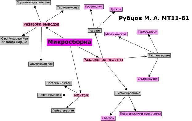Разварка выводов производится от контактных площадок интегральной схемы к стандартным выводам корпуса заданной конструкции. Один из наиболее распространенных методов – термокомпрессия. Этот метод соединения металлов с металлами микросваркой давлением с подогревом соединяемых деталей. Температура соединения при термокомпрессии не превышает температуру образования эвтектики соединяемых материалов. Термокомпрессия ограничена числом сочетаний свариваемых материалов. Термокомпресионная микросварка – это сварка, которая происходит благодаря одновременному воздействию двух параметров: температуры и давления. Тепловая энергия в зону сварки может подаваться путем нагрева платы, путем нагрева рабочего инструмента, либо двумя способами одновременно. Данный метод требует тщательного контроля параметров сварки – температуры, давления и времени проведения процесса, поэтому проведения данного вида сварки в ручном режиме затруднено. Так как для достижения приемлемого качества сварки необходимо проводить нагрев печатной платы, данный способ нельзя применять для операций, где нагрев недопустим.