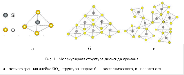 Молекулярная структура SiO2 имеет вид четырехгранной ячейки (рис.1, а), в которой атом кремний Si находится в центре тетраэдра из четырех атомов кислорода О, а атомы кислорода – по углам тетраэдра, связывая ячейки между собой. При этом каждый атом кислорода соединен с двумя атомами кремния.