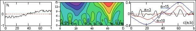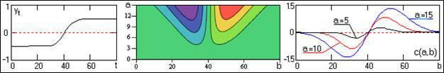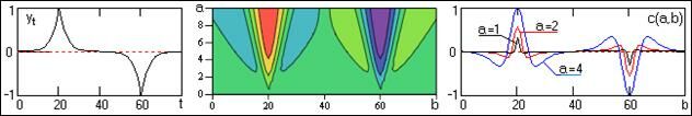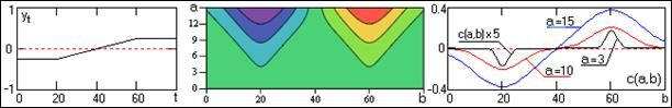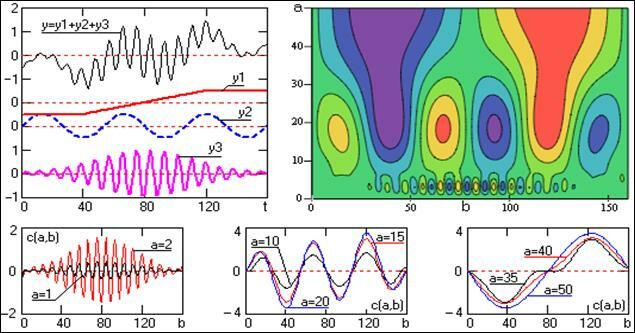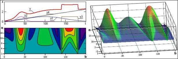 На рис. 2.1.6 приведен пример использования вейвлета для анализа сложного сигнала y(t). Модель сигнала образована суммой сигналов разной структуры. Сигналы у1-у2 представляют собой функции Гаусса разного масштабного уровня, сигнал у3 - прямоугольный импульс, сигнал у4 задан в виде тренда с постоянным значением дифференциала. На контурном графике вейвлет-коэффициентов можно видеть выделение всех трех основных структур сигнала при полном исключении тренда. Особенно четко выделяются границы скачков прямоугольной структуры. Справа на рисунке приведена полная трехмерная картина вейвлет-преобразования.