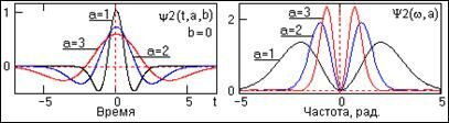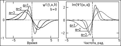 WАVE-вейвлет вычисляется по первой производной (n=1) и приведен на рис. 2.1.3 во временной и частотной области для трех значений масштабных коэффициентов 'а'. Форма вейвлета относится к нечетным функциям и, соответственно, спектр вейвлета является мнимым. Уравнение вейвлета по (2.1.1') с единичной нормой: