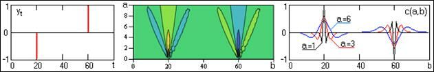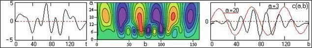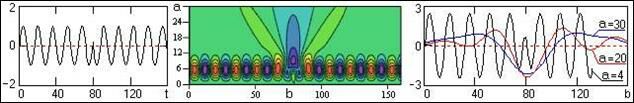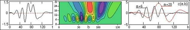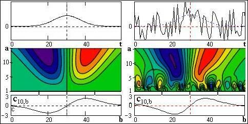 На рис. 2.1.4 приведен пример применения вейвлета для анализа двух однотипных сигналов, один из которых осложнен шумами с мощностью на уровне мощности самого сигнала. Как следует из  рисунка, контурная масштабно-временная картина вейвлетных коэффициентов, а равно и ее сечения на больших значениях масштабных коэффициентов 'а' (малых доминирующих частотах вейвлетов) очень точно и уверенно фиксирует положение вершины информационного сигнала сменой знака коэффициентов С(a,b).