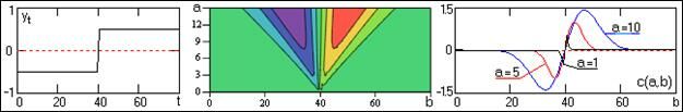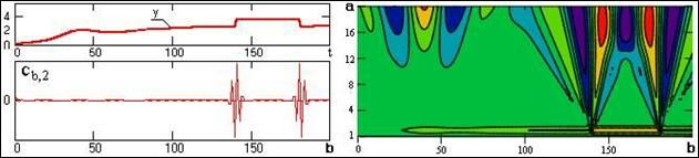 При изломах функций спектрограммы уверенно фиксируют место изломов максимумами (минимумами) значений коэффициентов c(a,b), как это показано на рис. 2.3.5. При наложении на такие функции шумов точное определение места изломов по масштабным сечениям на малых значениях параметра 'а' становится невозможным, однако на больших значениях параметра 'а' такая возможность сохраняется, естественно, с уменьшением точности локализации.