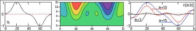 По вертикальным сечениям (сечениям сдвига b) вейвлет-спектр отражает компонентный состав сигнала (из данного комплекта вейвлетов) в каждый текущий момент. По смыслу преобразования, как скалярного произведения сигнала с вейвлетом, ясно, что значения коэффициентов в каждой текущей временной точке по масштабным сечениям тем больше, чем сильнее корреляция между вейвлетом данного масштаба и поведением сигнала в окрестностях этой точки. Соответственно, сечения по параметру 'а' демонстрируют изменения в сигнале компоненты данного масштаба 'a' со временем.