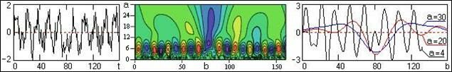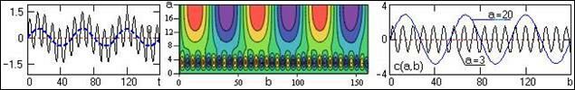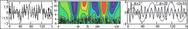 Разделение гармонических функций на масштабной оси спектров, в том числе при наложении сильных шумовых процессов, приведено в примерах на рис. 2.3.6. Приведенный пример имеет чисто иллюстративный характер, так как для выделения гармонических процессов с постоянной частотой во времени целесообразно использовать спектральный анализ и частотные полосовые фильтры. Тем не менее, для локальных сигналов, типа модулированных гармоник, вейвлет-спектры достаточно хорошо показывают место их локализации на временной оси.